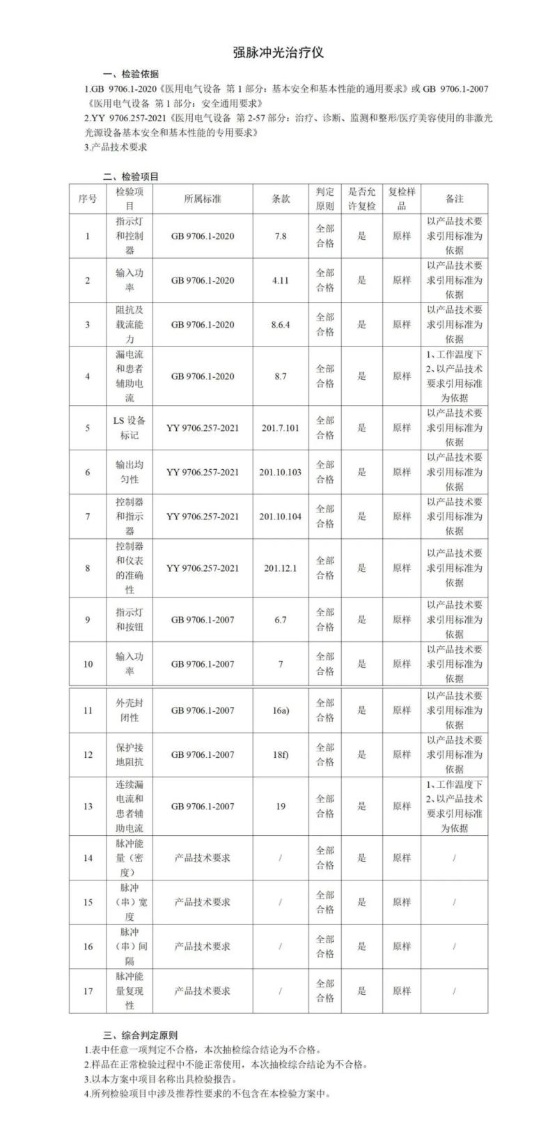 其中針對強(qiáng)脈沖光治療儀,國家藥監(jiān)局共提出了漏電流和患者輔助電流、LS設(shè)備標(biāo)記、輸出均勻性、脈沖(串)寬度、脈沖(串)間隔等17個檢驗項目,同時指出,任意一項判定不合格,抽檢綜合結(jié)論即為不合格。具體如下: