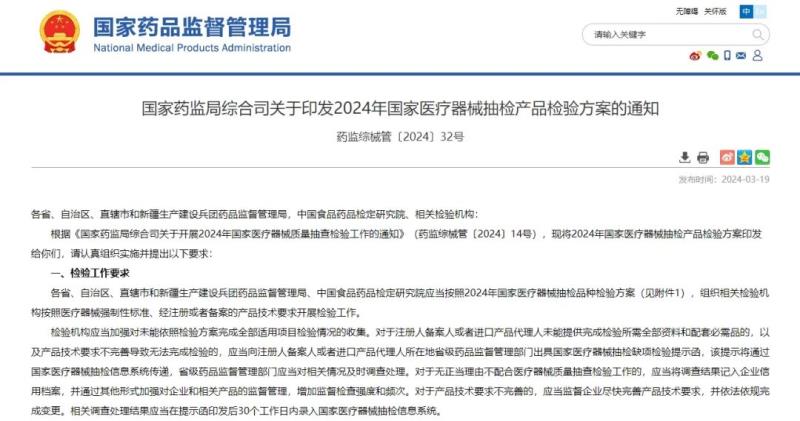 3月19日,國家藥監(jiān)局官網(wǎng)發(fā)布《2024年國家醫(yī)療器械抽檢產(chǎn)品檢驗方案,強(qiáng)脈沖光治療儀、醫(yī)用脈搏血氧儀、醫(yī)用分子篩制氧機(jī)、超聲治療設(shè)備、水膠體敷料66個品種被納入抽檢品種名單。