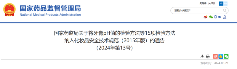關(guān)于將牙膏pH值的檢驗(yàn)方法等15項(xiàng)檢驗(yàn)方法納入《化妝品安全技術(shù)規(guī)范(2015年版)》的通告(2024年第13號(hào))