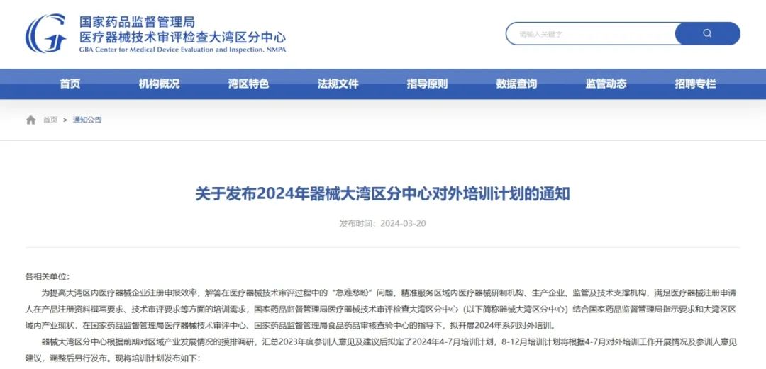 近日,國家藥監(jiān)局醫(yī)療器械技術(shù)審評檢查大灣區(qū)分中心發(fā)布2024年器械大灣區(qū)分中心對外培訓(xùn)計(jì)劃,公開了2024年4-7月培訓(xùn)計(jì)劃(公益培訓(xùn)),具體如下: