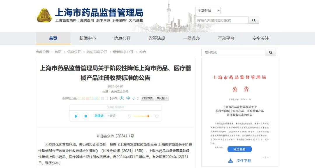 4月1日,上海市藥監(jiān)局發(fā)布公告稱,階段性降低上海市藥品、醫(yī)療器械產(chǎn)品注冊收費標(biāo)準(zhǔn),自2024年4月1日起施行,有效期至2024年12月31日。調(diào)整后的收費標(biāo)準(zhǔn)如下: