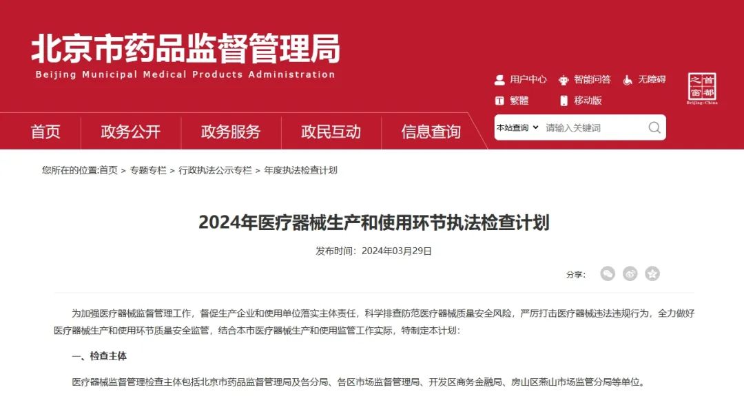 近日,北京市藥監(jiān)局發(fā)布《2024年醫(yī)療器械生產和使用環(huán)節(jié)執(zhí)法檢查計劃》,其中提到,截至2023年12月31日,全市共有醫(yī)療器械生產企業(yè)1000家,醫(yī)療器械使用單位11219家。依據《醫(yī)療器械生產監(jiān)督管理辦法》和《醫(yī)療器械使用質量監(jiān)督管理辦法》要求,各級監(jiān)管部門要按照計劃要求,嚴格落實監(jiān)管任務。具體如下: