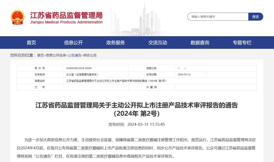 近日,江蘇省藥監(jiān)局發(fā)布通告稱,自2024年4月起,在每月公布江蘇省第二類醫(yī)療器械擬上市產(chǎn)品批準(zhǔn)注冊信息的同時(shí),同步公開產(chǎn)品技術(shù)審評報(bào)告。公眾可通過江蘇省藥品監(jiān)督管理局官網(wǎng)“公告通告”欄目,在批準(zhǔn)注冊的第二類醫(yī)療器械信息中查閱相關(guān)產(chǎn)品技術(shù)審評報(bào)告。