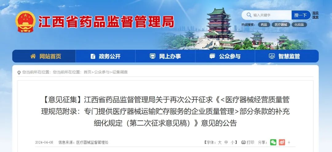 4月8日,江西省藥監(jiān)局發(fā)布《醫(yī)療器械經(jīng)營(yíng)質(zhì)量管理規(guī)范附錄:專門提供醫(yī)療器械運(yùn)輸貯存服務(wù)的企業(yè)質(zhì)量管理部分條款的補(bǔ)充細(xì)化規(guī)定(第二次征求意見(jiàn)稿)》(以下簡(jiǎn)稱《細(xì)化規(guī)定》),并向社會(huì)再次公開征求意見(jiàn)。