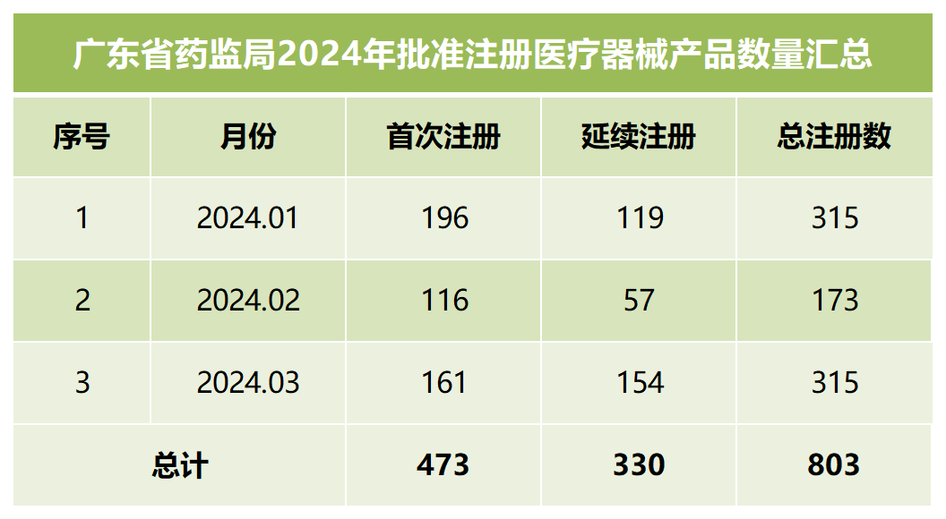 我們同步匯總了2024年第一季度廣東省藥監(jiān)局批準(zhǔn)注冊(cè)的醫(yī)療器械產(chǎn)品數(shù)量(見下方表格),從表格中可以看出,截至3月底,2024年廣東省藥監(jiān)局總計(jì)批準(zhǔn)注冊(cè)第二類醫(yī)療器械產(chǎn)品803個(gè),其中首次注冊(cè)473個(gè),延續(xù)注冊(cè)330個(gè)。