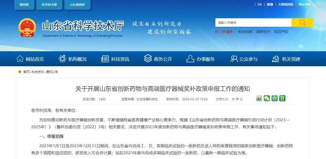 近日,山東省科學(xué)技術(shù)廳發(fā)布通知稱(chēng),根據(jù)《山東省創(chuàng)新藥物與高端醫(yī)療器械引領(lǐng)行動(dòng)計(jì)劃(2023-2025年)》(魯科創(chuàng)委辦發(fā)〔2022〕3號(hào))相關(guān)要求,決定開(kāi)展2023年度創(chuàng)新藥物與高端醫(yī)療器械獎(jiǎng)補(bǔ)政策申報(bào)工作,有關(guān)事項(xiàng)具體如下: