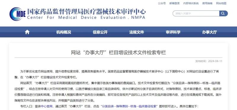 4月11日,國家藥監(jiān)局器審中心發(fā)布公告稱,對網(wǎng)站欄目設(shè)置進行了調(diào)整,在“辦事大廳”欄目增設(shè)技術(shù)文件檢索專欄。