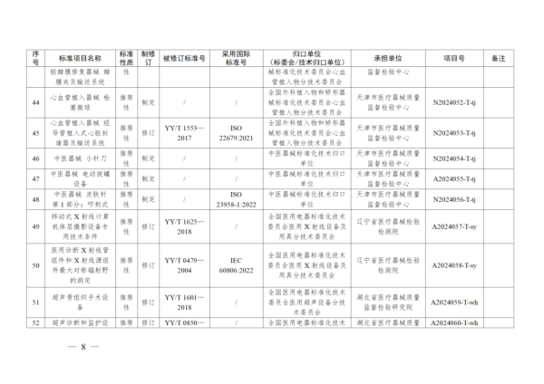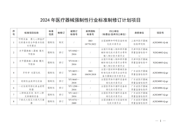 4月11日,國家藥監(jiān)局發(fā)布2024年醫(yī)療器械行業(yè)標(biāo)準(zhǔn)制修訂計(jì)劃,其中包含《呼吸設(shè)備 嬰兒心肺監(jiān)護(hù)儀的基本安全和基本性能專用要求》等8項(xiàng)強(qiáng)制性標(biāo)準(zhǔn)及《紫外治療設(shè)備》《注射用透明質(zhì)酸鈉溶液》等90項(xiàng)推薦性標(biāo)準(zhǔn),具體如下: