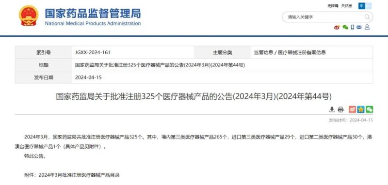4月15日,國(guó)家藥監(jiān)局官網(wǎng)發(fā)布公告稱,2024年3月,國(guó)家藥監(jiān)局共批準(zhǔn)注冊(cè)醫(yī)療器械產(chǎn)品325個(gè)。其中,境內(nèi)第三類醫(yī)療器械產(chǎn)品265個(gè),進(jìn)口第三類醫(yī)療器械產(chǎn)品29個(gè),進(jìn)口第二類醫(yī)療器械產(chǎn)品30個(gè),港澳臺(tái)醫(yī)療器械產(chǎn)品1個(gè)。