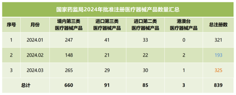 我們同步匯總了2024年第一季度國(guó)家藥監(jiān)局批準(zhǔn)注冊(cè)的醫(yī)療器械產(chǎn)品數(shù)量(見下方表格),從表格中可以看出,截至3月,2024年國(guó)家藥監(jiān)局總計(jì)批準(zhǔn)注冊(cè)醫(yī)療器械產(chǎn)品839個(gè),其中境內(nèi)第三類醫(yī)療器械產(chǎn)品660個(gè),進(jìn)口第三類醫(yī)療器械產(chǎn)品91個(gè),進(jìn)口第二類醫(yī)療器械產(chǎn)品85個(gè),港澳臺(tái)醫(yī)療器械產(chǎn)品3個(gè)