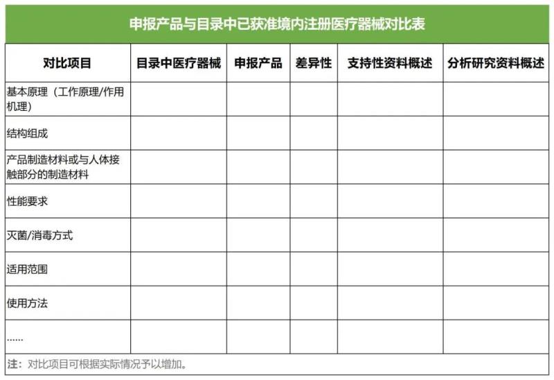 (一)提交申報(bào)產(chǎn)品相關(guān)信息與《目錄》所述內(nèi)容的對(duì)比資料; (二)提交申報(bào)產(chǎn)品與《目錄》中已獲準(zhǔn)境內(nèi)注冊(cè)醫(yī)療器械的對(duì)比說明,對(duì)比說明應(yīng)當(dāng)包括《申報(bào)產(chǎn)品與目錄中已獲準(zhǔn)境內(nèi)注冊(cè)醫(yī)療器械對(duì)比表》和相應(yīng)支持性資料。若經(jīng)對(duì)比,申報(bào)產(chǎn)品與對(duì)比產(chǎn)品存在差異,還應(yīng)提交差異部分對(duì)安全有效性影響的分析研究資料。二者的差異不應(yīng)引起不同的安全有效性問題,即申報(bào)產(chǎn)品未出現(xiàn)對(duì)比產(chǎn)品不存在的且可能引發(fā)重大風(fēng)險(xiǎn)和/或引起顯著影響有效性的問題。
