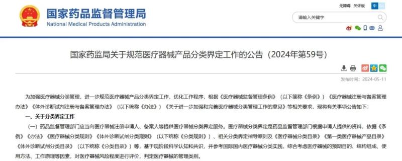 5月11日,國(guó)家藥監(jiān)局發(fā)布《關(guān)于規(guī)范醫(yī)療器械產(chǎn)品分類(lèi)界定工作的公告(2024年第59號(hào))》,具體內(nèi)容如下: