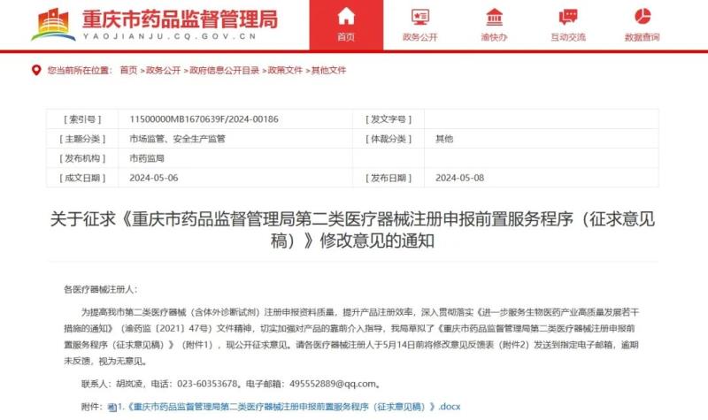 近日,重慶市藥監(jiān)局發(fā)布《重慶市藥品監(jiān)督管理局第二類醫(yī)療器械注冊(cè)申報(bào)前置服務(wù)程序(征求意見稿)》(以下簡(jiǎn)稱《程序》),并向社會(huì)公開征求意見。
