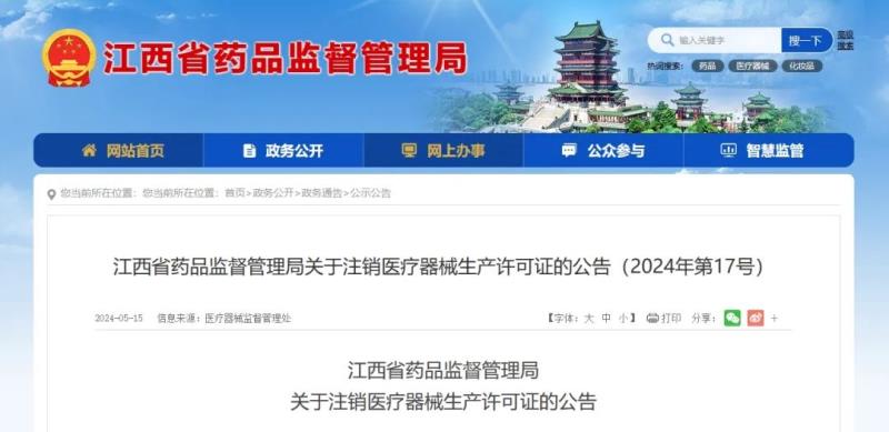 5月15日,江西省藥監(jiān)局官網(wǎng)發(fā)布一則醫(yī)療器械生產(chǎn)許可證注銷公告,公告顯示,該局已依法注銷江西創(chuàng)盈光醫(yī)療科技有限公司、江西省邁樂醫(yī)療器械有限公司等9家企業(yè)的醫(yī)療器械生產(chǎn)許可證,其中8家為主動申請注銷,1家為依法吊銷,具體明細如下: