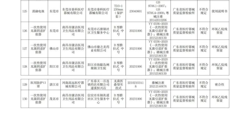 5月20日,廣東省藥監(jiān)局發(fā)布《關(guān)于醫(yī)療器械抽查檢驗(yàn)信息的通告(2024年第3期,總第88期)》(以下簡稱《通告》),《通告顯示,該局共抽檢了130批次產(chǎn)品,共有6批次不合格,不合格產(chǎn)品包括消融電極、一次性使用無菌陰道擴(kuò)張器、醫(yī)用防護(hù)口罩,具體如下:
