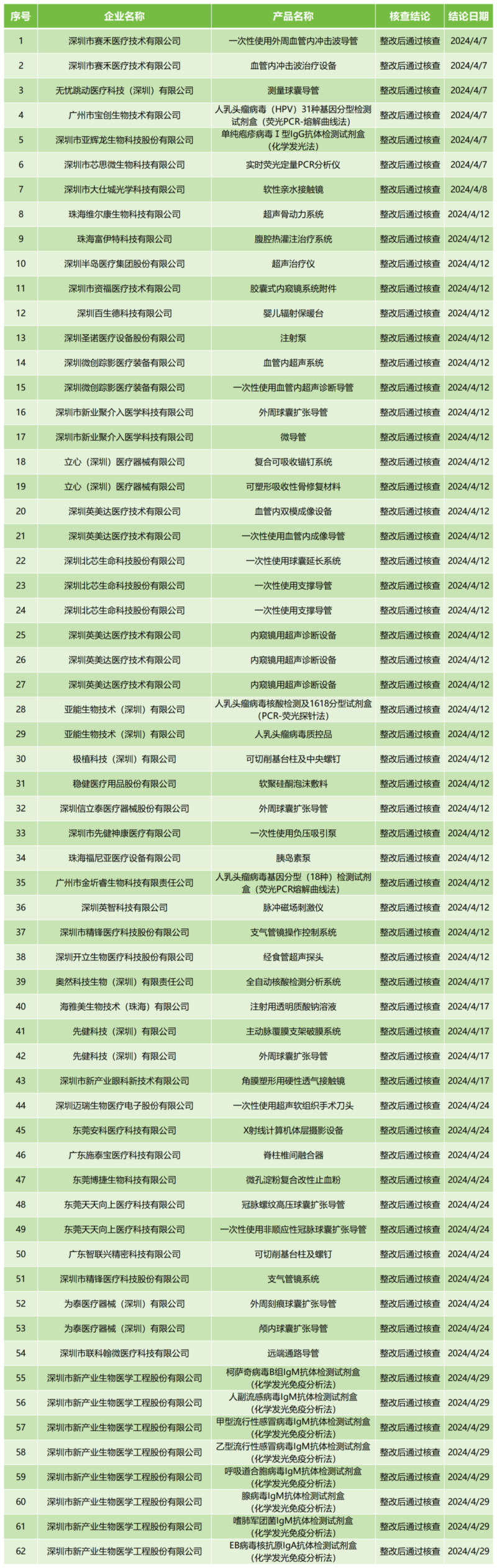 5月21日,廣東省藥監(jiān)局官網公布2024年4月醫(yī)療器械注冊質量管理體系核查結果,包括深圳半島醫(yī)療集團股份有限公司的超聲治療儀、海雅美生物技術(珠海)有限公司的注射用透明質酸鈉溶液、珠海福尼亞醫(yī)療設備有限公司的胰島素泵共計62款產品,均為“整改后通過核查”。具體明細見下方表格: