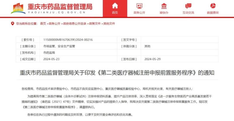 5月29日,重慶市藥監(jiān)局發(fā)布《第二類醫(yī)療器械注冊(cè)申報(bào)前置服務(wù)程序》(以下簡(jiǎn)稱《程序》),以提高第二類醫(yī)療器械(含體外診斷試劑)注冊(cè)申報(bào)資料質(zhì)量,提升產(chǎn)品注冊(cè)效率。其中提到【前置服務(wù)適用范圍為: