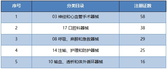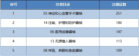 第三類醫(yī)療器械注冊證數(shù)量前五品種