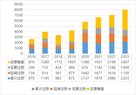 ↑ 圖 3  2016至2023年度廣東省第二類醫(yī)療器械注冊數(shù)據(jù)圖