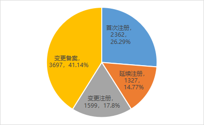 按注冊類型分,首次注冊申請2362件,占全部第二類醫(yī)療器械注冊申請的26.29%;延續(xù)注冊申請1327件,占全部第二類醫(yī)療器械注冊申請的14.77%;變更注冊申請1599件,占全部第二類醫(yī)療器械注冊申請的17.8%;變更備案申請3697件,占全部第二類醫(yī)療器械注冊申請的41.14%。注冊申請受理情況見圖1,類型分布比例情況見圖2。