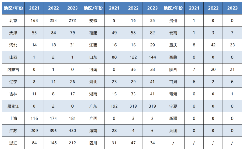 ↑ 表 8  2021-2023年度新增第三類醫(yī)療器械注冊數(shù)量各省分布情況(單位:件)