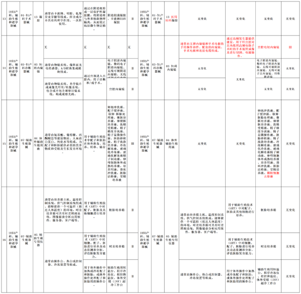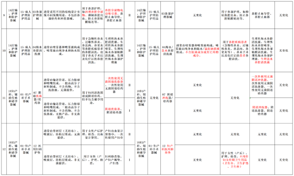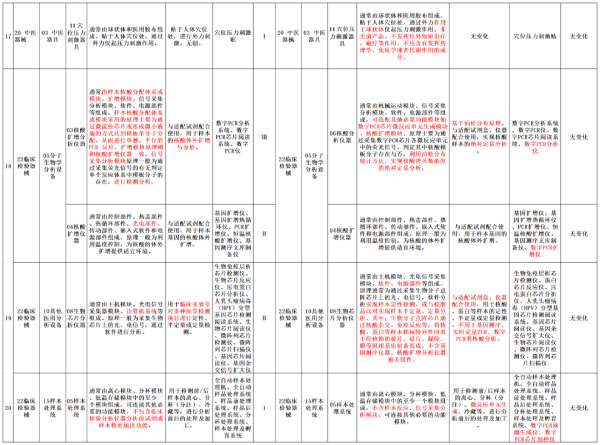本次調(diào)整意見對(duì)20類醫(yī)療器械產(chǎn)品進(jìn)行了產(chǎn)品描述、預(yù)期用途或管理類別的調(diào)整,我們以圖片形式將其展示如下(點(diǎn)擊圖片可放大查看):