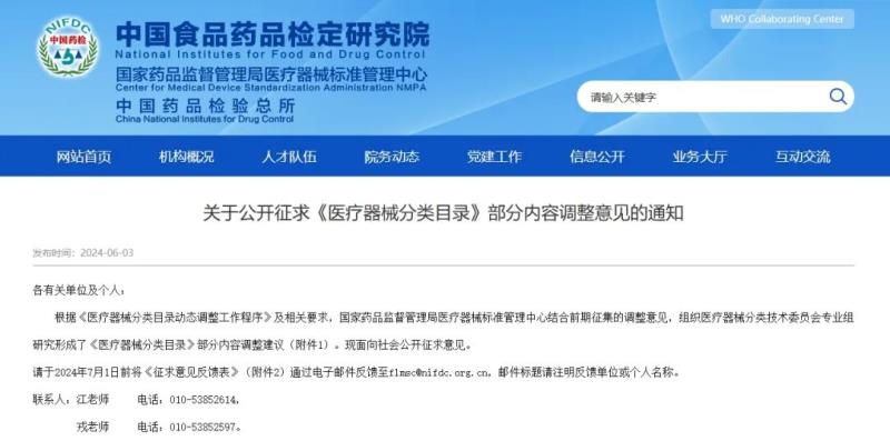 6月3日,國(guó)家藥監(jiān)局醫(yī)療器械標(biāo)管中心發(fā)布《關(guān)于公開征求〈醫(yī)療器械分類目錄〉部分內(nèi)容調(diào)整意見的通知》,并向社會(huì)公開征求意見。