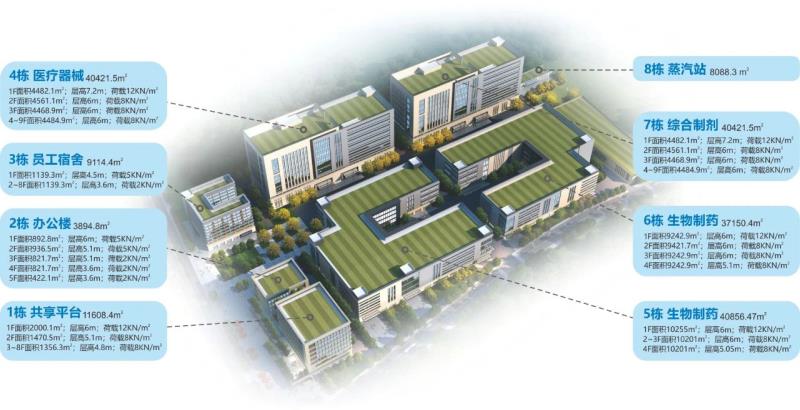 三醫(yī)智造中心一期為工業(yè)載體,總占地123畝,總建筑面積25萬(wàn)㎡,其中產(chǎn)業(yè)建筑面積18.3萬(wàn)㎡,建設(shè)高承重、高層高標(biāo)準(zhǔn)廠(chǎng)房,配置雙回路供電、蒸汽站、污水處理站、?;瘞?kù)、倒班房等設(shè)施。層高4.8-7.2m,承重0.8-1.2噸,面積單層最大可達(dá)1萬(wàn)㎡。主要引入綜合制劑、生物技術(shù)藥、醫(yī)療器械、細(xì)胞治療、綠色食品、電子信息等項(xiàng)目的中試與生產(chǎn)。
