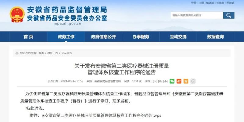 近日,安徽省藥監(jiān)局發(fā)布《安徽省第二類醫(yī)療器械注冊質(zhì)量管理體系核查工作程序》(以下簡稱《工作程序》),具體內(nèi)容如下: