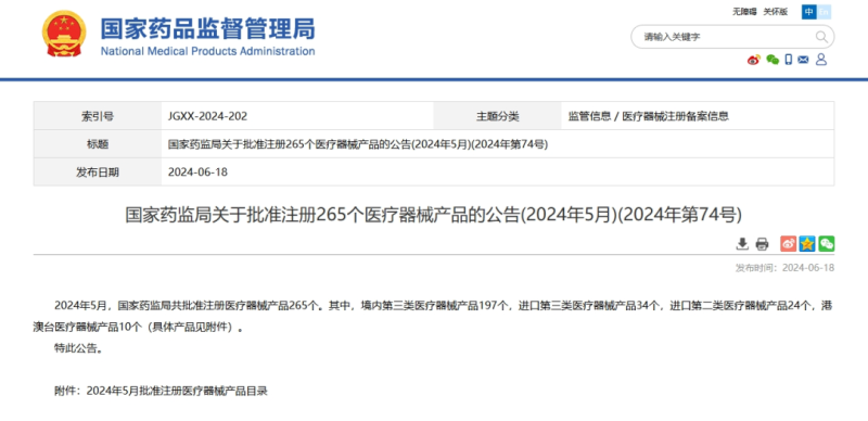 6月18日,國家藥監(jiān)局官網(wǎng)發(fā)布公告稱,2024年5月,國家藥監(jiān)局共批準(zhǔn)注冊醫(yī)療器械產(chǎn)品265個。其中,境內(nèi)第三類醫(yī)療器械產(chǎn)品197個,進(jìn)口第三類醫(yī)療器械產(chǎn)品34個,進(jìn)口第二類醫(yī)療器械產(chǎn)品24個,港澳臺醫(yī)療器械產(chǎn)品10個。