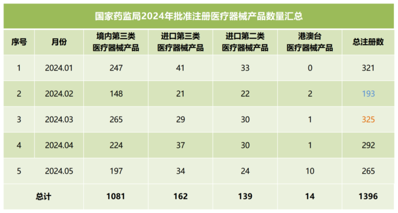 我們同步匯總了2024年前五個月國家藥監(jiān)局批準(zhǔn)注冊的醫(yī)療器械產(chǎn)品數(shù)量(見下方表格),從表格中可以看出,截至5月,2024年國家藥監(jiān)局總計批準(zhǔn)注冊醫(yī)療器械產(chǎn)品1396個,其中境內(nèi)第三類醫(yī)療器械產(chǎn)品1081個,進(jìn)口第三類醫(yī)療器械產(chǎn)品162個,進(jìn)口第二類醫(yī)療器械產(chǎn)品139個,港澳臺醫(yī)療器械產(chǎn)品14個。