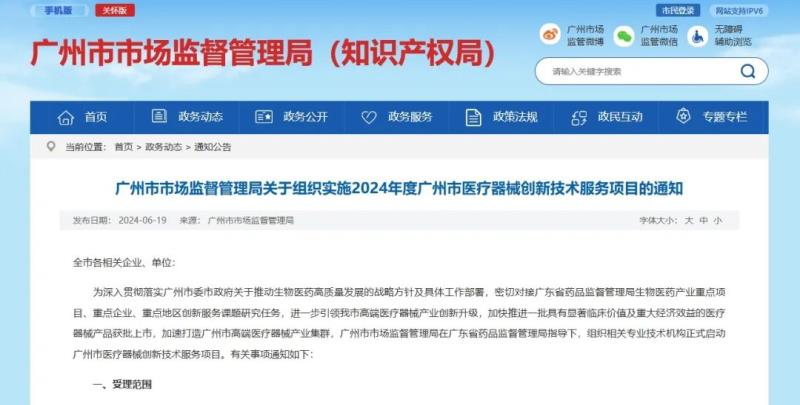 6月19日,廣州市市場(chǎng)監(jiān)督管理局發(fā)布《關(guān)于組織實(shí)施2024年度廣州市醫(yī)療器械創(chuàng)新技術(shù)服務(wù)項(xiàng)目的通知》(以下簡(jiǎn)稱《通知》),《通知》指出,該局已組織相關(guān)專業(yè)技術(shù)機(jī)構(gòu)正式啟動(dòng)廣州市醫(yī)療器械創(chuàng)新技術(shù)服務(wù)項(xiàng)目。具體事項(xiàng)如下: