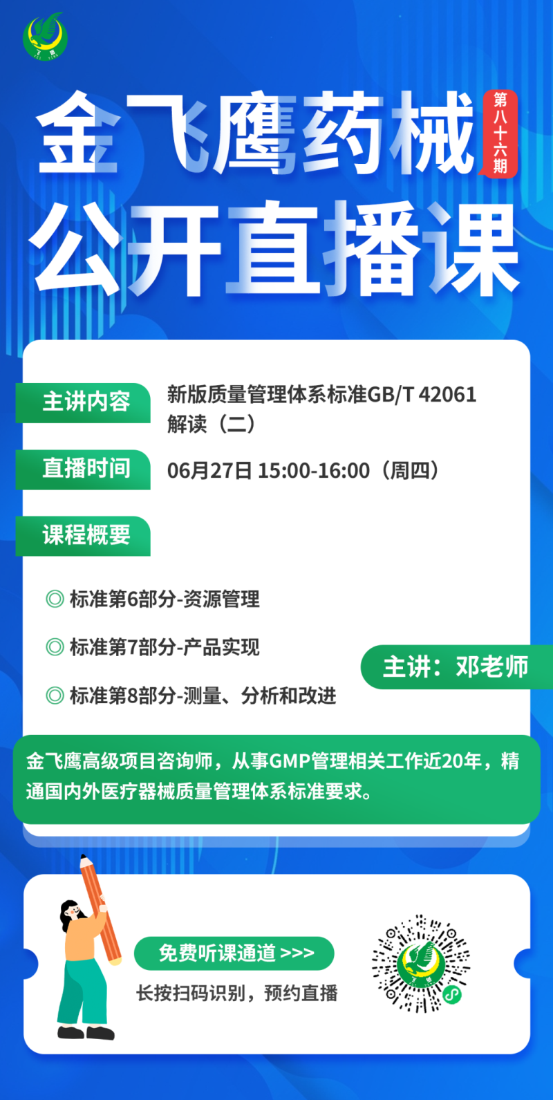 6月27日下午3點(diǎn),金飛鷹高級項目咨詢師,從事GMP管理相關(guān)工作近20年,精通國內(nèi)外醫(yī)療器械質(zhì)量管理體系標(biāo)準(zhǔn)要求的鄧?yán)蠋?/span>,給大家?guī)怼缎掳驷t(yī)療器械質(zhì)量管理體系標(biāo)準(zhǔn)GB/T 42061解讀(二)》,培訓(xùn)內(nèi)容是標(biāo)準(zhǔn)的第6-8部分(資源管理、產(chǎn)品實(shí)現(xiàn)、測量/分析和改進(jìn))解讀,大家千萬不要錯過了哦!