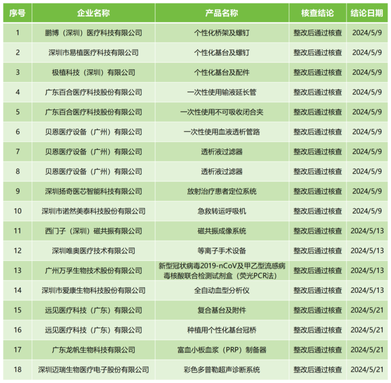 6月25日,廣東省藥監(jiān)局官網(wǎng)公布2024年5月醫(yī)療器械注冊質(zhì)量管理體系核查結(jié)果,包括西門子(深圳)磁共振有限公司的磁共振成像系統(tǒng)、深圳唯奧醫(yī)療技術(shù)有限公司的等離子手術(shù)設(shè)備、深圳邁瑞生物醫(yī)療電子股份有限公司的彩色多普勒超聲診斷系統(tǒng)共計18款產(chǎn)品,均為“整改后通過核查”。具體明細見下方表格:
