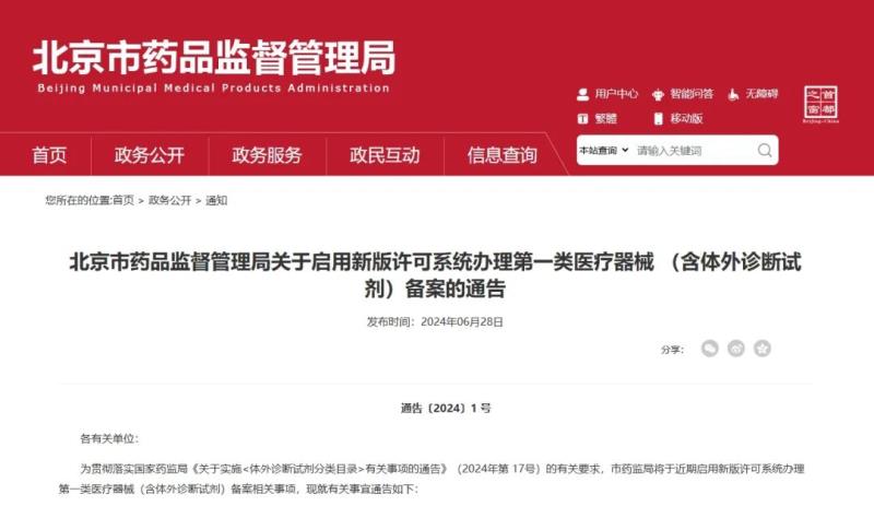 近日,北京市藥監(jiān)局發(fā)布通告稱,自2024年7月1日起,第一類醫(yī)療器械(含體外診斷試劑備案相關(guān)事項(xiàng)(含新辦、變更)使用新版許可系統(tǒng)辦理。上述事項(xiàng)的原申報入口同步關(guān)閉。