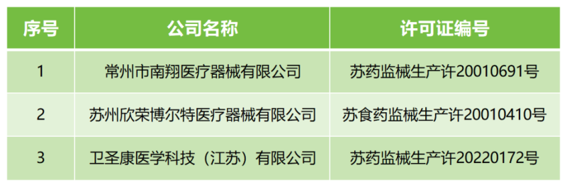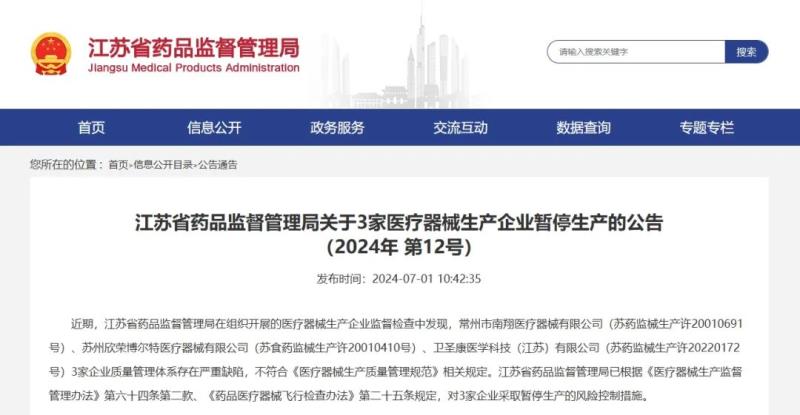 江蘇省藥品監(jiān)督管理局已根據(jù)《醫(yī)療器械生產(chǎn)監(jiān)督管理辦法》第六十四條第二款、《藥品醫(yī)療器械飛行檢查辦法》第二十五條規(guī)定,對3家企業(yè)采取暫停生產(chǎn)的風(fēng)險控制措施。