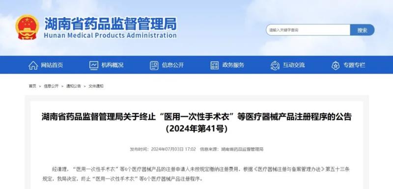 7月3日,湖南藥監(jiān)局發(fā)布公告稱,“醫(yī)用一次性手術(shù)衣”“醫(yī)用皮膚修復膜”等6個醫(yī)療器械產(chǎn)品的注冊申請人未按規(guī)定繳納注冊費用,根據(jù)《醫(yī)療器械注冊與備案管理辦法》第五十三條規(guī)定,該局決定終止這6個醫(yī)療器械產(chǎn)品注冊程序,具體明細如下: