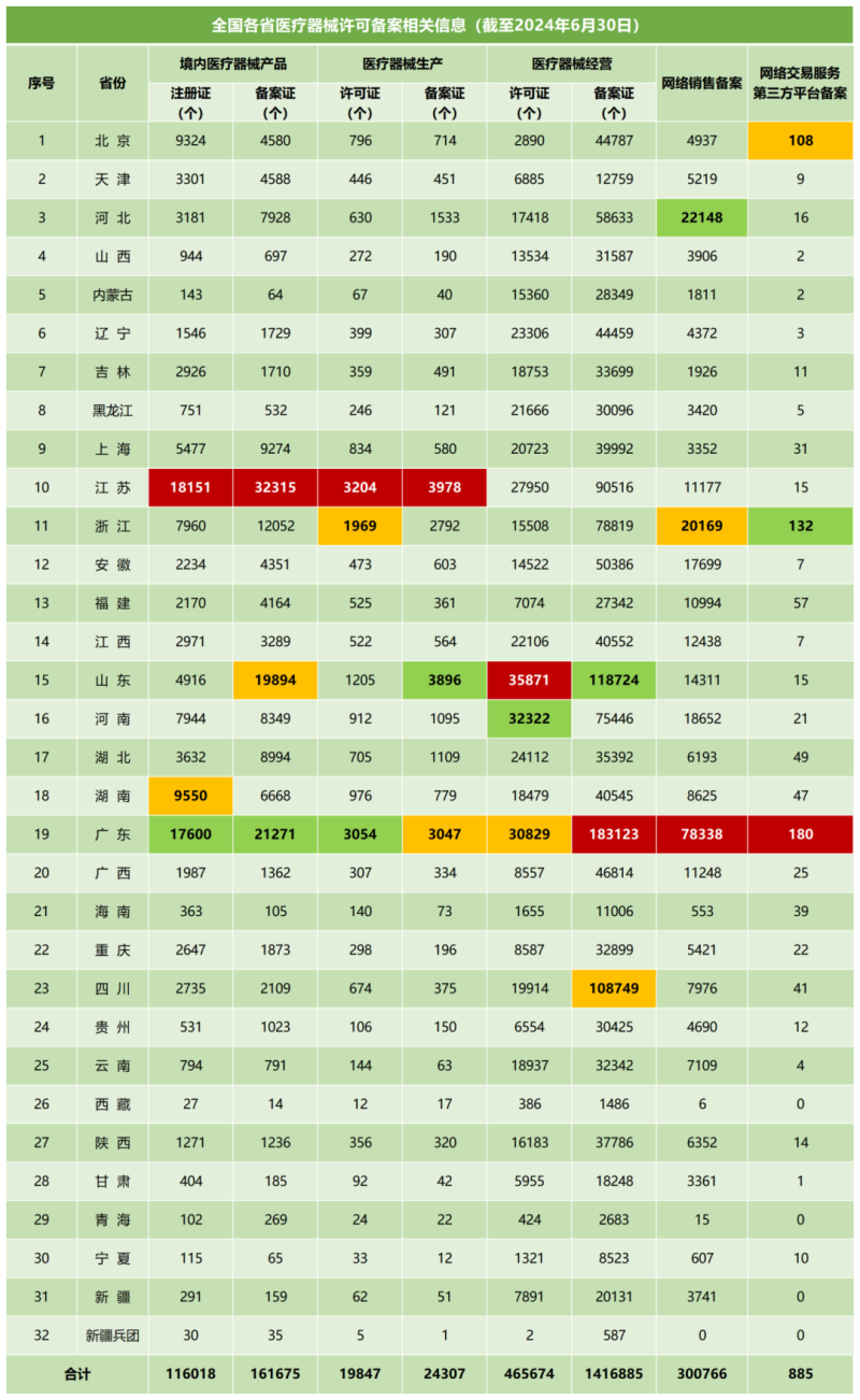 7月8日,國家藥監(jiān)局公布了截至2024年6月30日各省有效期內(nèi)醫(yī)療器械產(chǎn)品注冊備案、醫(yī)療器械生產(chǎn)企業(yè)許可備案等信息,老規(guī)矩,金飛鷹小編對此稍作編輯,標(biāo)注紅色、綠色、黃色的分別為前三甲。