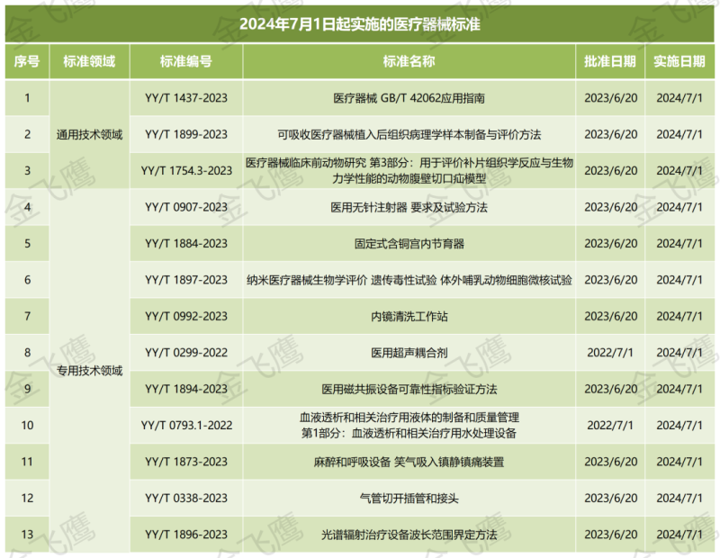 2024年7月1日起正式實(shí)施的共有13項(xiàng)醫(yī)療器械標(biāo)準(zhǔn),其中最值得大家關(guān)注的是YY/T 1437-2023《醫(yī)療器械 GB/T 42062應(yīng)用指南》,除此之外YY/T 0907-2023《醫(yī)用無針注射器 要求及試驗(yàn)方法》、YY/T 1896-2023《光譜輻射治療設(shè)備波長范圍界定方法,具體明細(xì)如下: