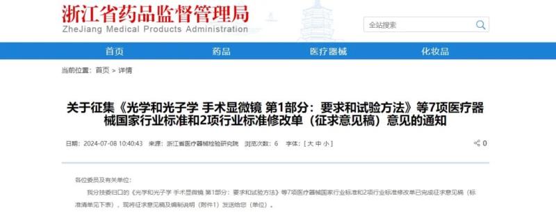 7月8日,浙江省藥監(jiān)局轉載了浙江省醫(yī)療器械檢驗研究院有關征集《光學和光子學 手術顯微鏡 第1部分:要求和試驗方法》《強脈沖光治療設備》7項醫(yī)療器械國家/行業(yè)標準和2項行業(yè)標準修改單意見的通知,具體標準清單如下:
