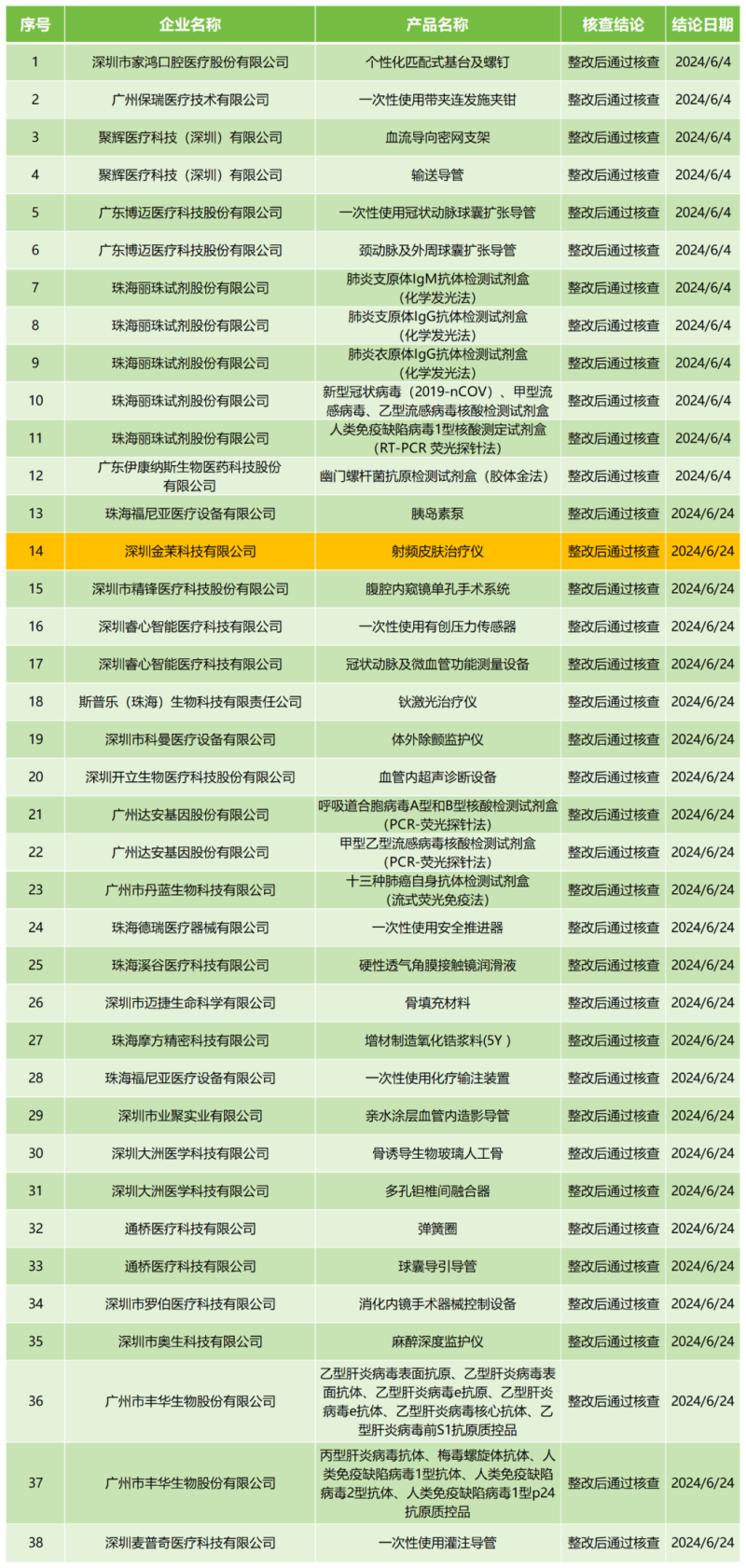 7月16日,廣東省藥監(jiān)局官網(wǎng)公布2024年6月醫(yī)療器械注冊質(zhì)量管理體系核查結(jié)果,包括深圳市家鴻口腔醫(yī)療股份有限公司的個性化匹配式基臺及螺釘、珠海福尼亞醫(yī)療設(shè)備有限公司的胰島素泵、深圳金茉科技有限公司的射頻皮膚治療儀等共計38款產(chǎn)品,均為“整改后通過核查”。具體明細見下方表格: