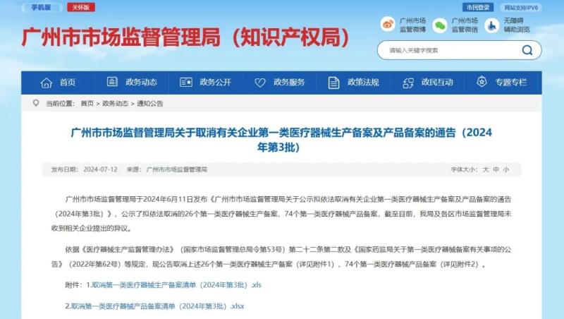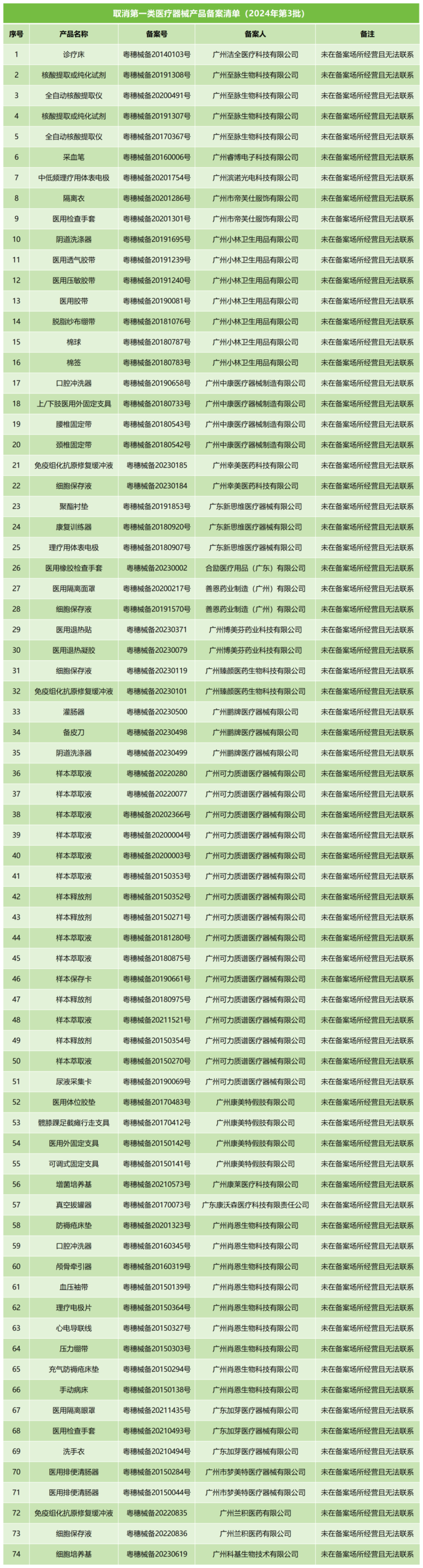 近日,廣州市市場(chǎng)監(jiān)督管理局官網(wǎng)發(fā)布一則取消第一類醫(yī)療器械生產(chǎn)備案及產(chǎn)品備案的通告,通告指出,因廣州至脈生物科技有限公司、廣州小林衛(wèi)生用品有限公司、廣州中康醫(yī)療器械制造有限公司等第一類醫(yī)械產(chǎn)品備案人未在備案場(chǎng)所經(jīng)營(yíng)且無法聯(lián)系,該局在公示期結(jié)束后決定取消這些企業(yè)名下的74個(gè)第一類醫(yī)療器械產(chǎn)品備案,具體明細(xì)如下: