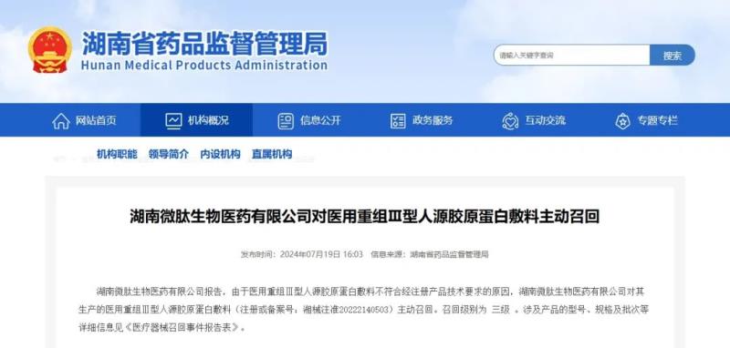 湖南一企業(yè)主動(dòng)召回其生產(chǎn)的醫(yī)用重組Ⅲ型人源膠原蛋白敷料