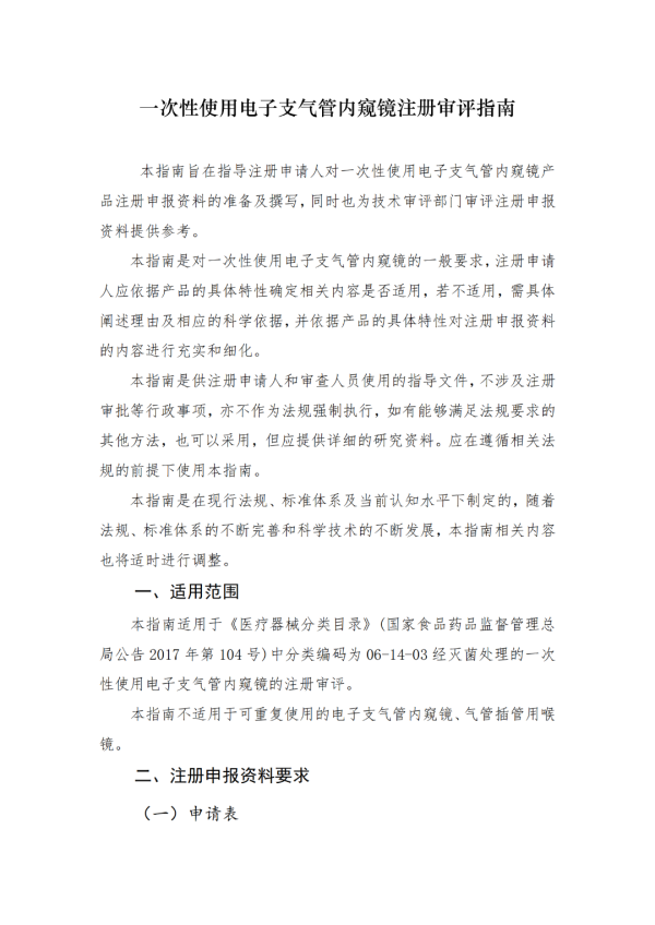 該指南適用于《醫(yī)療器械分類目錄》(國家食品藥品監(jiān)督管理總局公告2017年第 104號)中分類編碼為06-14-03經滅菌處理的一次性使用電子支氣管內窺鏡的注冊審評。對可重復使用的電子支氣管內窺鏡、氣管插管用喉鏡不適用。