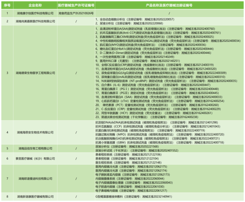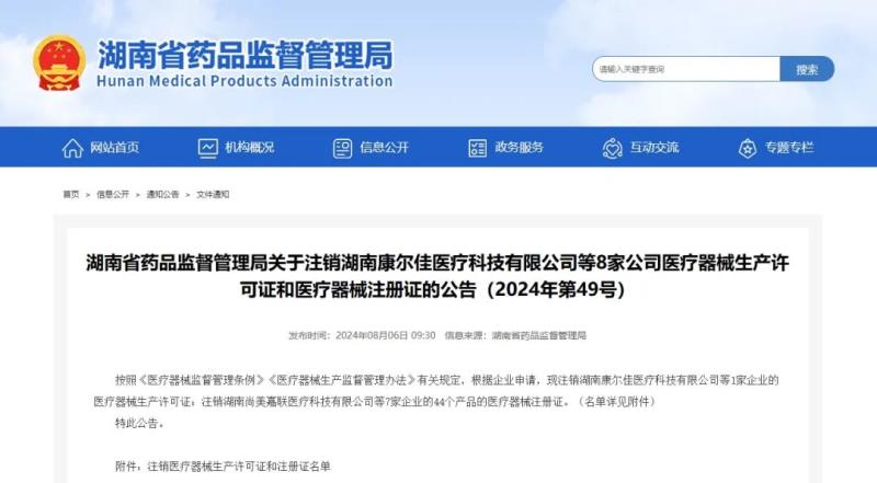 8月6日,湖南省藥監(jiān)局發(fā)布公告稱,按照《醫(yī)療器械監(jiān)督管理條例》《醫(yī)療器械生產(chǎn)監(jiān)督管理辦法》有關(guān)規(guī)定,根據(jù)企業(yè)申請,現(xiàn)注銷湖南康爾佳醫(yī)療科技有限公司等1家企業(yè)的醫(yī)療器械生產(chǎn)許可證;注銷湖南尚美嘉聯(lián)醫(yī)療科技有限公司等7家企業(yè)的44個產(chǎn)品的醫(yī)療器械注冊證,具體明細如下: