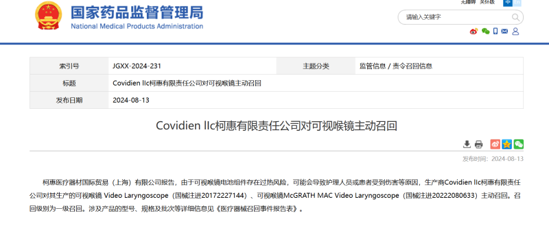 一級召回!柯惠有限責(zé)任公司對可視喉鏡主動召回