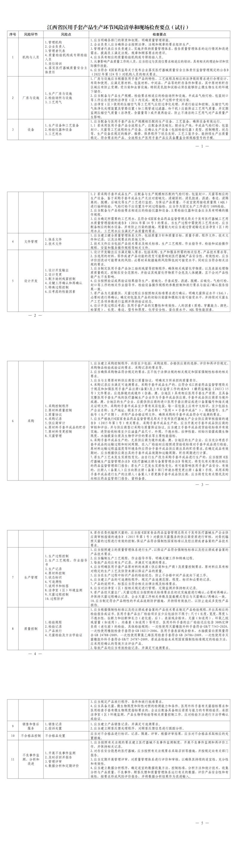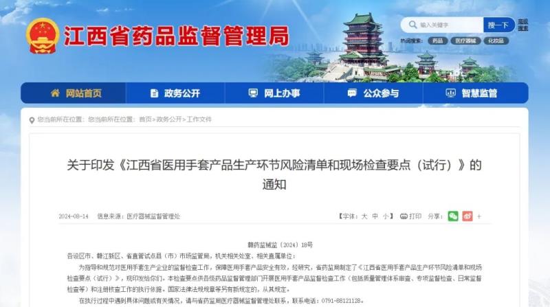 8月14日,江西省藥監(jiān)局發(fā)布《江西省醫(yī)用手套產(chǎn)品生產(chǎn)環(huán)節(jié)風(fēng)險清單和現(xiàn)場檢查要點(diǎn)(試行)》(以下簡稱《檢查要點(diǎn)》),作為各級藥品監(jiān)督管理部門開展醫(yī)用手套產(chǎn)品監(jiān)督檢查工作(包括質(zhì)量管理體系審查、專項(xiàng)監(jiān)督檢查、日常監(jiān)督檢查等)和注冊核查工作的執(zhí)行依據(jù)。