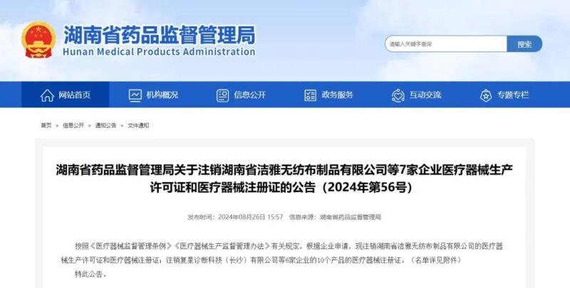 8月26日,湖南省藥監(jiān)局發(fā)布公告稱,按照《醫(yī)療器械監(jiān)督管理?xiàng)l例》《醫(yī)療器械生產(chǎn)監(jiān)督管理辦法》有關(guān)規(guī)定,根據(jù)企業(yè)申請,現(xiàn)注銷湖南省潔雅無紡布制品有限公司的醫(yī)療器械生產(chǎn)許可證和醫(yī)療器械注冊證;注銷復(fù)星診斷科技(長沙)有限公司6家企業(yè)10個(gè)產(chǎn)品的醫(yī)療器械注冊證,具體明細(xì)如下:
