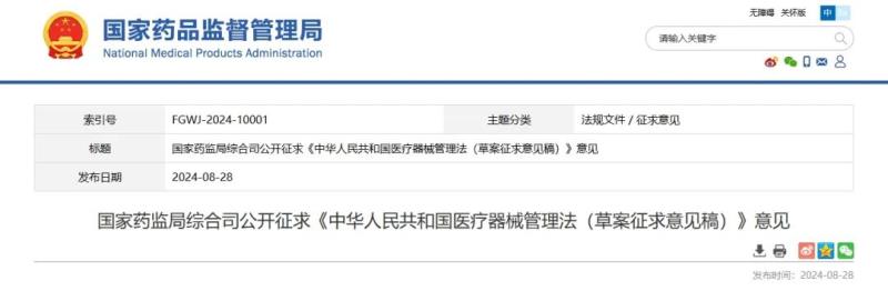8月28日,國(guó)家藥監(jiān)局發(fā)布《中華人民共和國(guó)醫(yī)療器械管理法(草案征求意見稿)》(以下簡(jiǎn)稱《醫(yī)療器械管理法》),并向社會(huì)公開征求意見。意見反饋途徑和方式如下:
