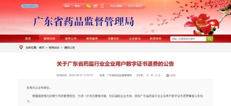 近日,廣東省藥監(jiān)局發(fā)布《關(guān)于廣東省藥監(jiān)行業(yè)企業(yè)用戶數(shù)字證書退費(fèi)的公告》,具體內(nèi)容如下: